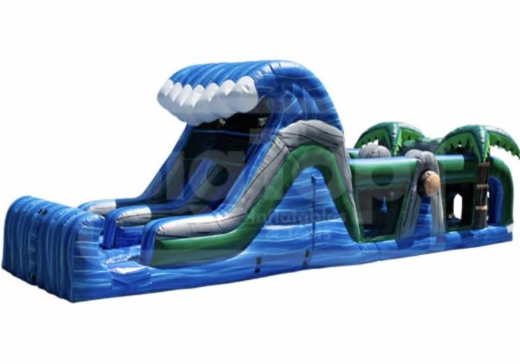 The Tidal Waves obstacle course measures 43 feet long and features a full tropical color scheme of blue, green, and brown with palm tree and wave details throughout. It includes climbing sections, obstacle elements, and a double-lane slide exit that can be used wet with a water connection or kept dry for cooler months. This unit is recommended for kids ages five and up, with a maximum rider capacity that allows continuous flow during busy events. It requires one standard 110-volt electrical outlet and access for setup and takedown.