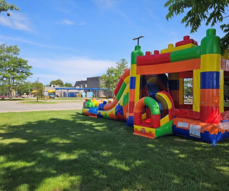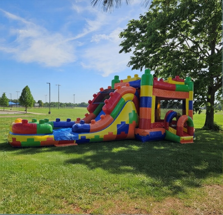 Leaping Lego packs a serious amount of activity into one giant unit. The 12x12 jump area gives kids plenty of room to bounce without bumping into each other, the basketball hoop adds a competitive element, and the rock wall delivers a climbing challenge before the big payoff — a giant slide that works just as well dry as it does with water. Hook it up to a standard garden hose on a hot Middle Tennessee afternoon and the slide transforms into a full water adventure complete with a refreshing splash finish that keeps kids cool and coming back for more.