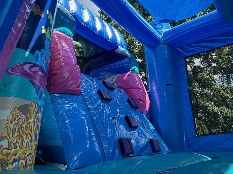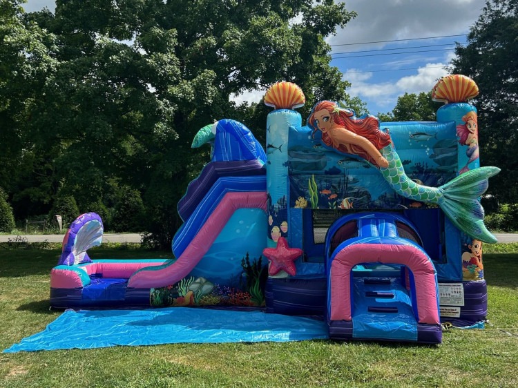 The Little Mermaid Combo is a vibrant undersea-themed inflatable featuring a bounce house, 10-foot water slide, and splash zone, available for rent throughout Murfreesboro and the surrounding Middle Tennessee area. This enchanting unit brings the magic of the ocean to backyards and events across Rutherford County and nearby communities, creating an immersive aquatic experience that turns any celebration into an unforgettable adventure under the sea.